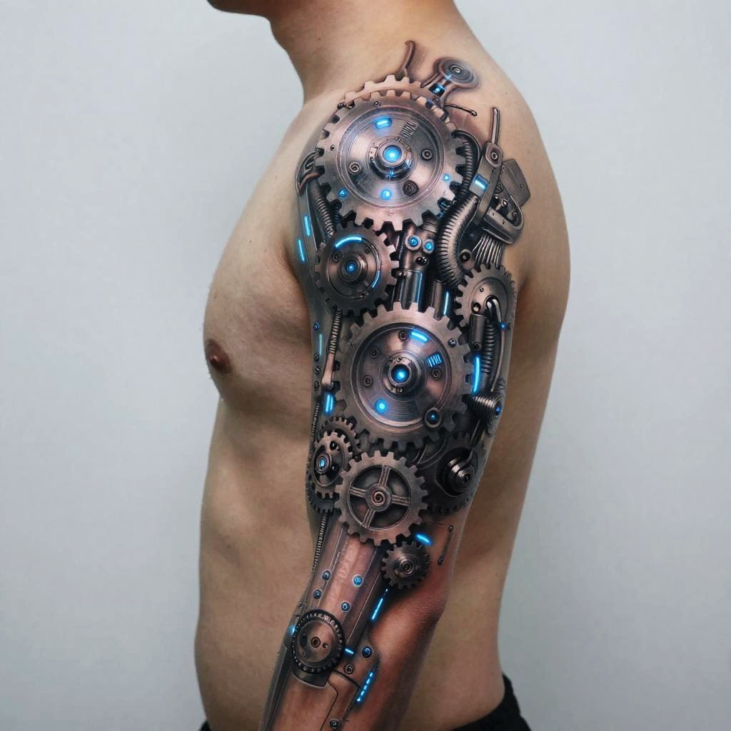 Flesh gear tattoo on a futuristic cyborg arm, intricate mechanical gears embedded seamlessly under translucent skin, glowing blue highlights, hyper-realistic style, sci-fi theme