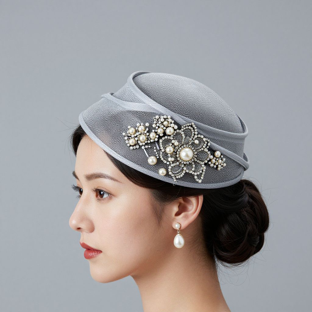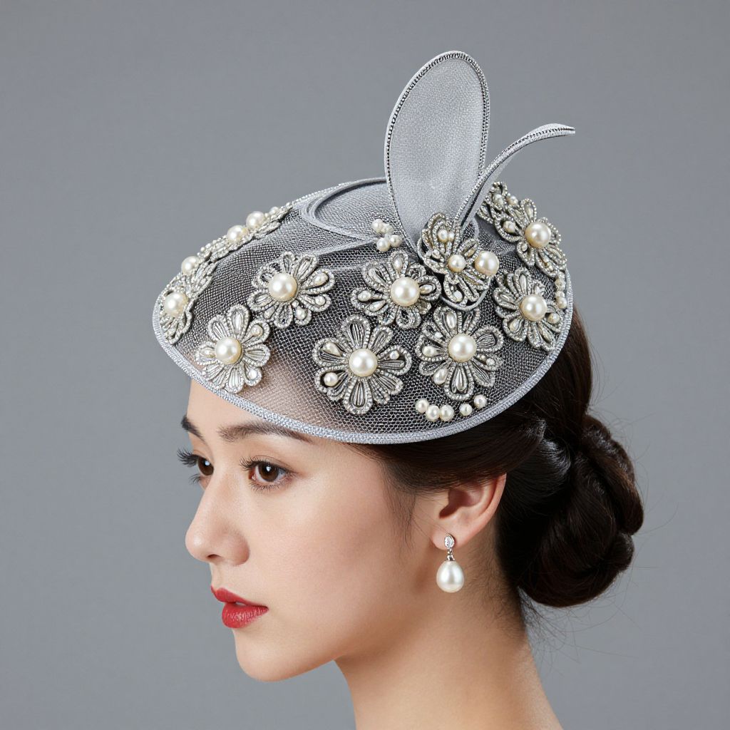 Elegant vintage-inspired fascinator hat adorned with intricate bejeweled floral patterns and pearls, worn by a woman with a classic updo hairstyle and pearl earrings, set against a soft gray backdrop.