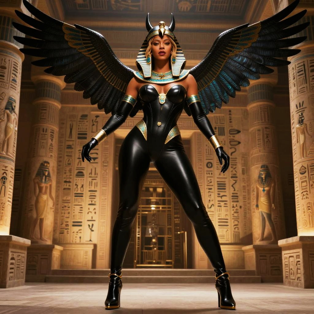 Cinematic vfx movie still full figure frame of a smooth, elegant, powerful, (muscular:1.3), tall, proud, flirting, sexy, beyonce as a flirting posing dominant powerful warrior wearing a (black:1.6) (latex:1.4) falcon (horus:0.90) suit, dancing Egyptian science fiction (torture chamber:1.2) (dungeon:1.1) tomb (prison:1.3), epic volumetric lighting, film grain, centered, full body, (masterpiece, best quality, highres, photo-referenced:1.1), (science fiction:1.1), sparkling eyes, caustics, (character focus), (perfect anatomy:1.2), (realistic, photorealistic:1.5), tight fitting, (science fiction:1.3) (hawk:1.2) (digitigrade:1.4) Egyptian style power armor designed by Joseph A. Porro, (gauntlet:1.4), inside an Egyptian temple with hieroglyphs depicting female symbols, (seen from below:1.3), atmospheric, volumetric lighting, mix of natural lighting and artificial lighting, cinematography by Karl Walter Lindenlaub, directed by Roland Emmerich, (photorealistic:1.4), big (breasts:1.4), nipples, photo