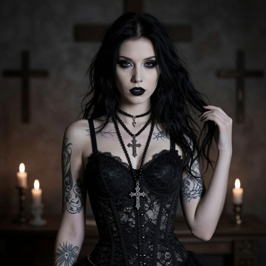 Photograph of a pale-skinned woman with black hair and gothic style, standing in a dimly lit room. She's wearing a black lace corset, multiple black necklaces with a cross pendant, and has prominent tattoos on her arms. She's touching her hair with one hand, and there are lit candles and crosses in the blurred background. The overall vibe is dark and mystical.
