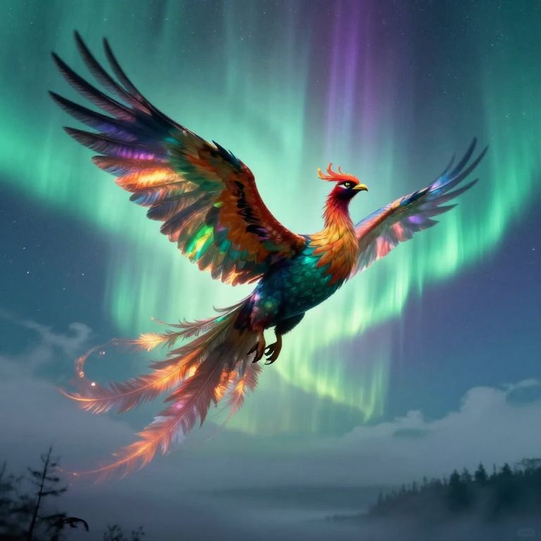 Imagine a Renaissance-inspired painting with photorealistic details, portraying an awe-inspiring griffin flying amidst a captivating aurora sky. The bird's feathers are exquisitely rendered, displaying a mesmerizing spectrum of colors that shimmer as they catch the light from below, while its all-knowing eyes add to its enigmatic presence. Seen from a low vantage point, the viewer is granted an intimate view of the griffin's wings and talons, adorned with intricate patterns. The otherworldly backdrop features luminous streaks of green, pink, and blue lights, creating a gradient that instills feelings of amazement, serenity, and wonder as they dance around the majestic creature.