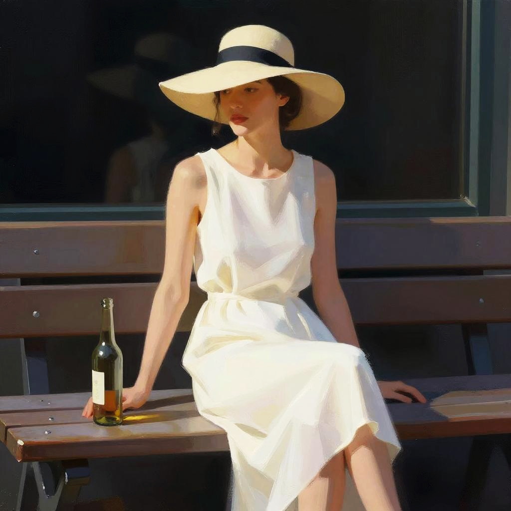 This is a digital art piece of a stylish woman sitting on a bench. She's wearing a sleeveless, white, flowy dress and a large, wide-brimmed hat with a black ribbon. The hat casts a shadow over her face, making her expression subtle. She's holding a glass bottle on a small table beside her. The background is dark, highlighting her illuminated figure. The art style has a painterly, almost impressionistic feel with bold, contrasting colors.