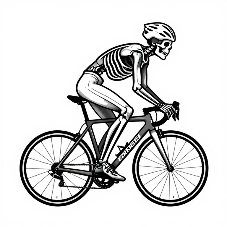 Granulation black and white line are tatoo. White background. Design includes a road bicycle with a skeleton riding it,