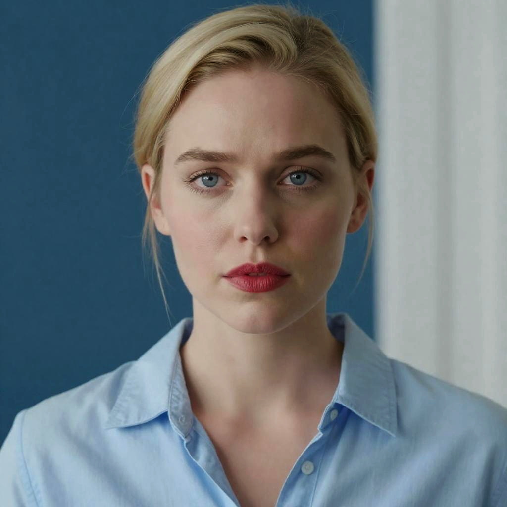 Close-up portrait of a blonde woman with light skin and blue eyes wearing a light blue button-up shirt. She has red lipstick and her hair is pulled back. The background features a blue wall and a white panel. The woman has a slightly pensive expression.