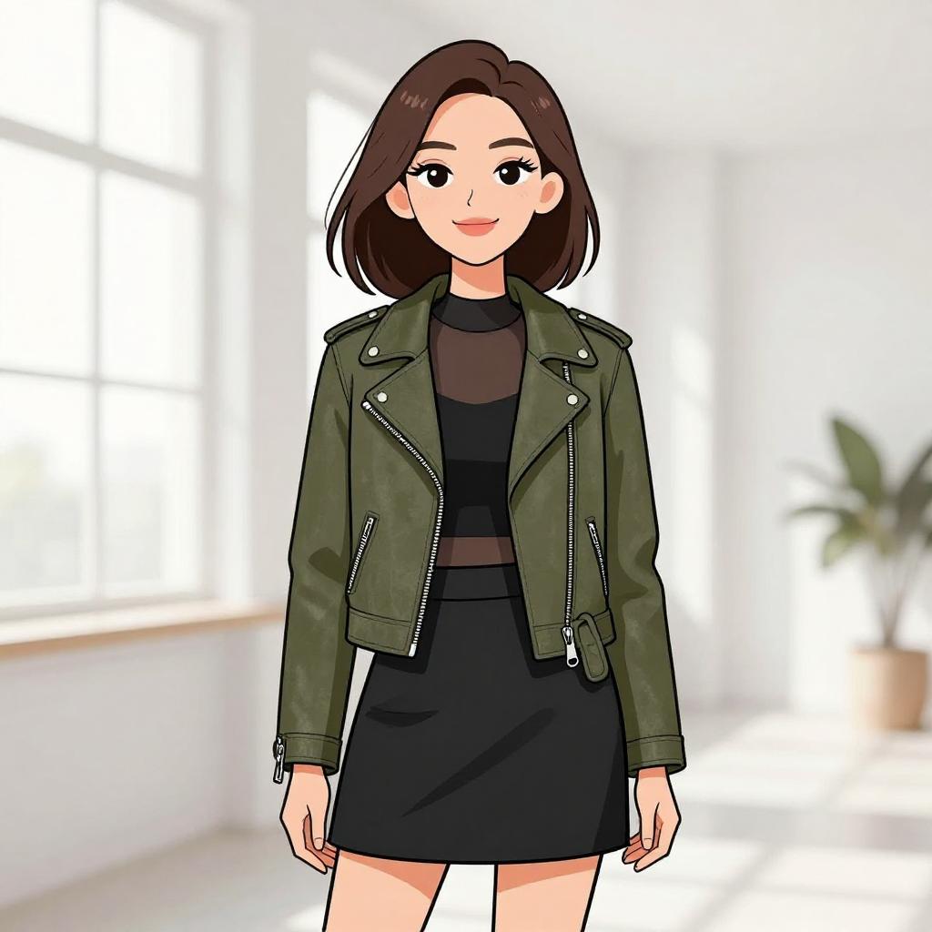 Woman with pretty face and pretty hair. smiling Woman, urban chic, olive green suede biker jacket, notch lapels, asymmetric zip closure, zippered pockets, belted waist, layered over a black sheer mesh top, solid black panel at chest, short black flared skirt, minimal accessories, white room with large windows. --sref 1467
