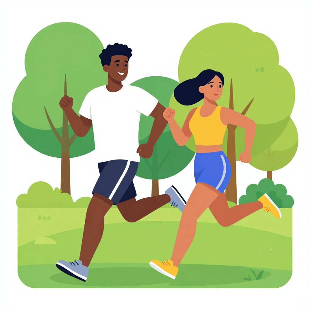 Digital illustration of two diverse runners in a bright, green park. A dark-skinned man with short black hair, wearing a white t-shirt, navy blue shorts, and white sneakers, runs slightly behind a light-skinned woman with long black hair, dressed in a yellow sleeveless top and blue shorts, with yellow sneakers. Both are smiling and in mid-stride. The background features stylized, green trees with circular canopies and a grassy field. The image uses bold, flat colors and simple shapes, creating a cheerful, energetic vibe.