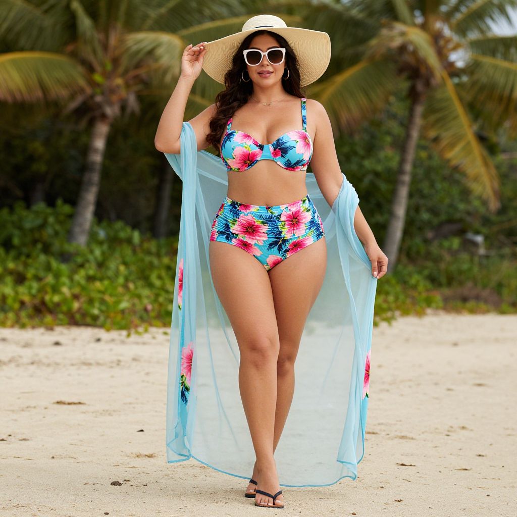 Photograph of a curvy woman with tan skin, wearing a floral bikini, wide-brimmed hat, white sunglasses, and light blue sheer robe