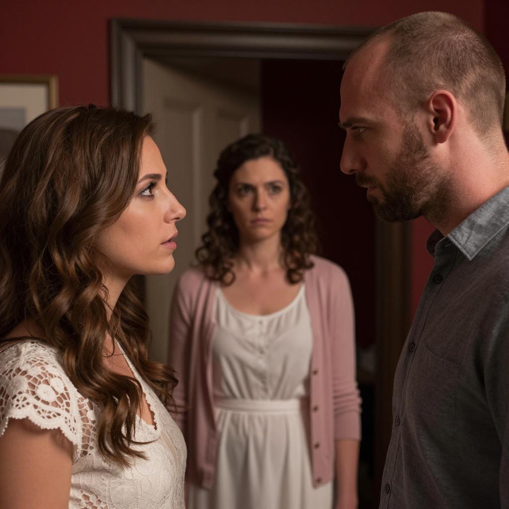 Photograph of a tense scene with two people in the foreground and one in the background. Woman with wavy brown hair, light skin, and white lace top, gazing at bald man with stubble and beard, wearing gray shirt. Background woman, light-skinned, curly hair, white dress, and pink cardigan, standing in doorway. Dimly lit room, red walls. Man's profile shows downward gaze, woman's face intense. Doorframe visible behind background woman.