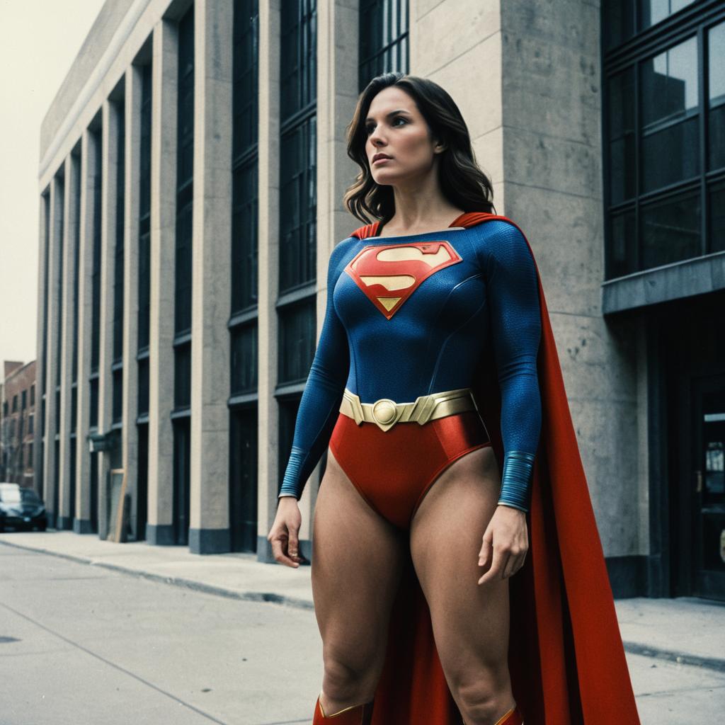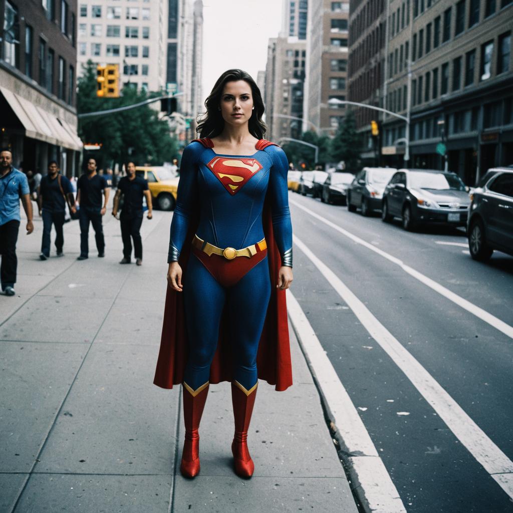 Superhero Villains, a woman in a superman costume standing on a city street