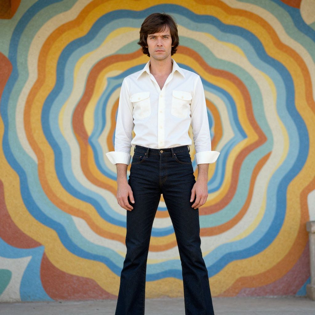 Full body portrait, medium distance, natural light, soft focus, bright colors, bold composition, the subject's face turned slightly towards the camera, his eyes radiating confidence and determination, standing proudly before an eye-catching, psychedelic spiral pattern in the background, rich Kodacolor tones, 1970s-inspired aesthetic. Man has masculine face and piercing eyes