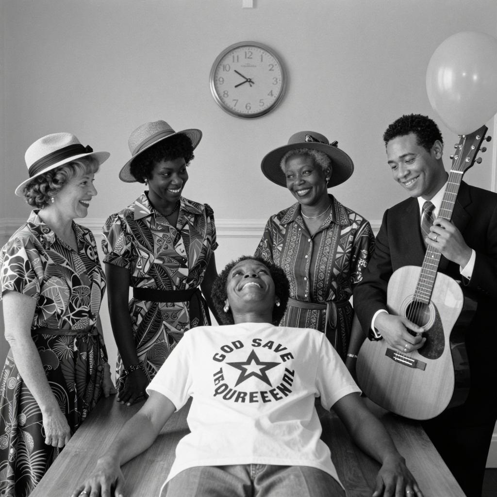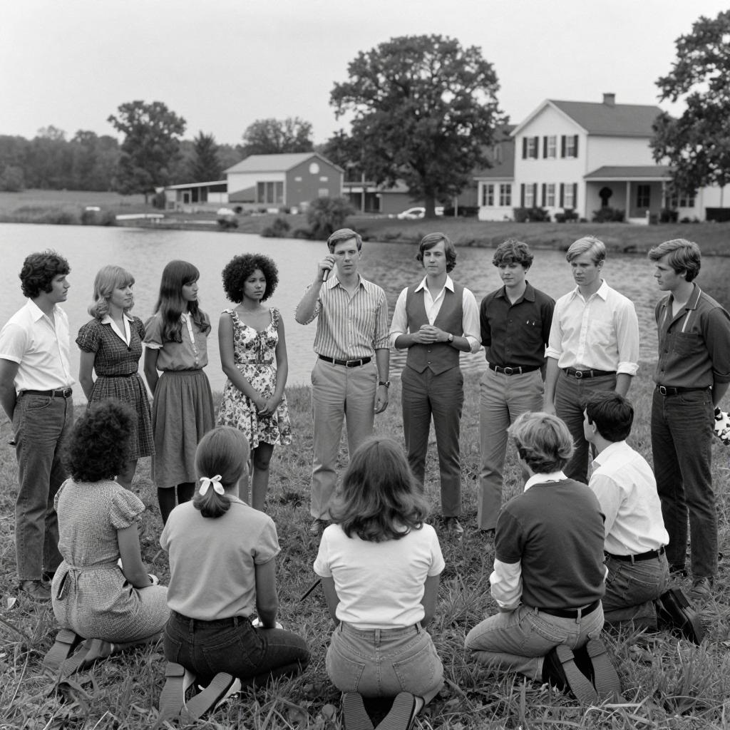 Black-and-white photograph of 15 people standing and kneeling in a grassy field near a lake and house. One man holds a microphone stand above his head. People wear various casual 1970s clothing. Some wear dresses, others shirts and vests. Mixed expressions, mostly neutral. Background includes trees and distant buildings.