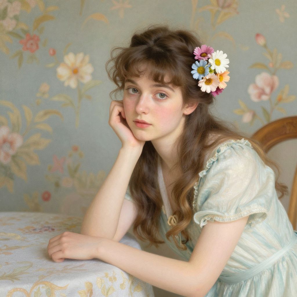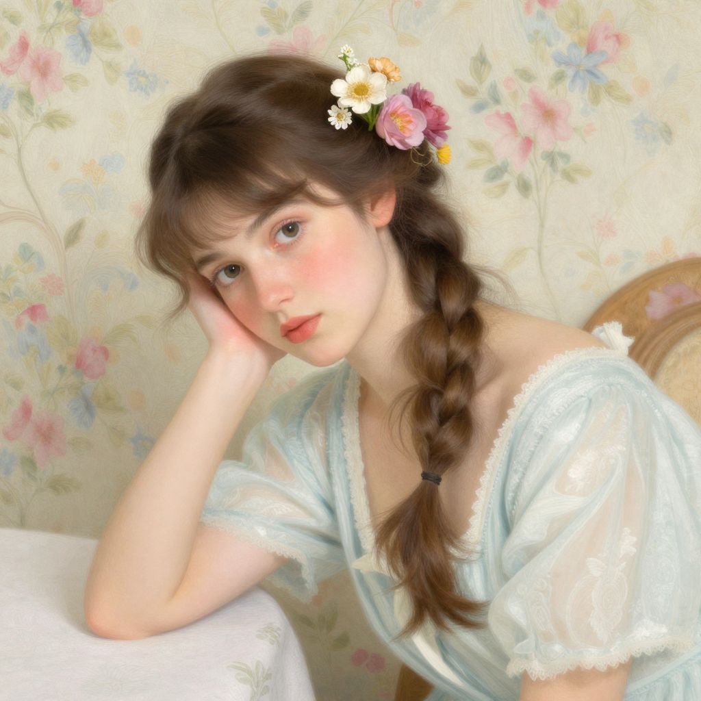 This digital painting depicts a young woman with fair skin and delicate features, seated and gazing thoughtfully to the side. She has long, dark brown hair styled in a loose braid adorned with white, yellow, and pink flowers. She wears a light blue, off-shoulder, lace-trimmed blouse. Her right hand rests on her cheek. The background features a soft, floral-patterned wallpaper in pastel shades of pink, blue, and green. The image has a soft, romantic, and slightly ethereal quality, with gentle lighting and delicate textures. The woman is positioned slightly to the left, with a white, lace-covered surface in the bottom left corner.