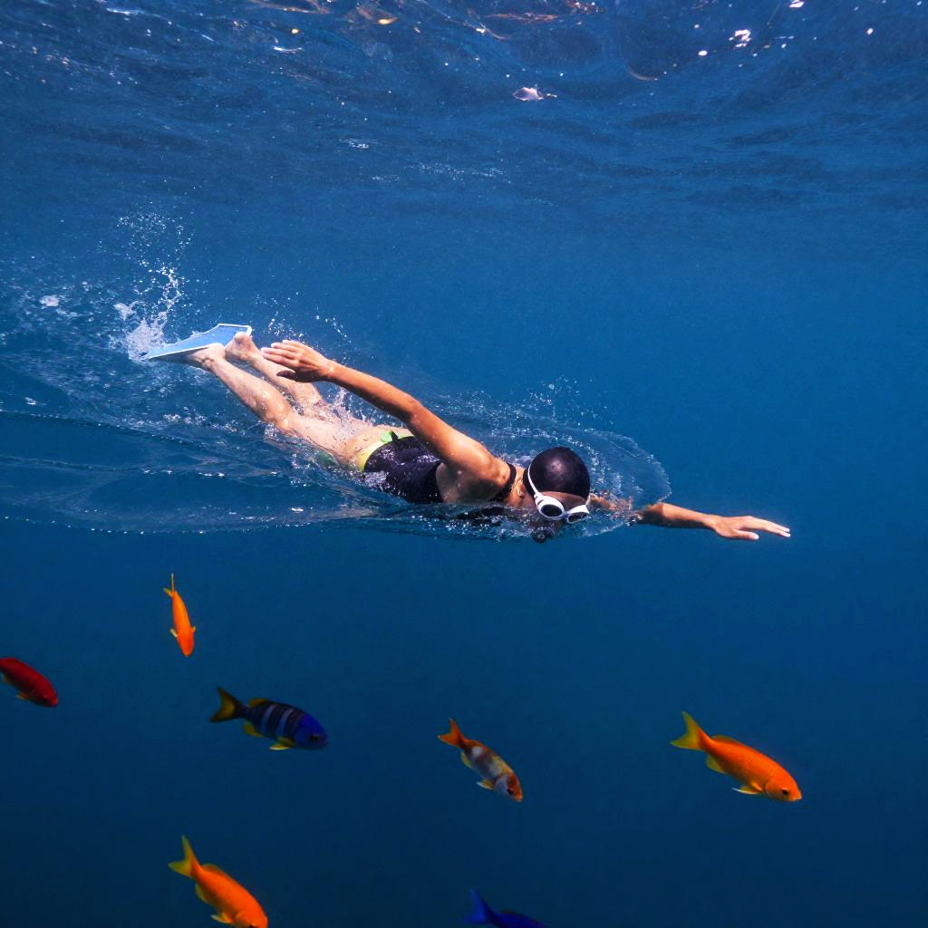 Lone Swimmer Amidst Vibrant Coral Reef and Fish