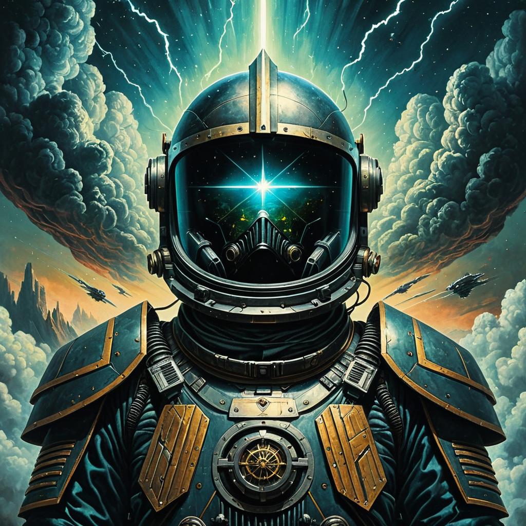 Skull in astronaut helmet detailed, epic masterpiece of cinematographic hyperrealism, realistic shaded lighting poster by craig mallismo, artgerm, jeremy! dream a stylized 2 d cinematic keyframe of a post - apocalyptic school interior covered by nature, debris, abandoned, joy gaze, cel - shaded, classical animation, edge - to - edge print, rendered by studio ghibli, artgerm