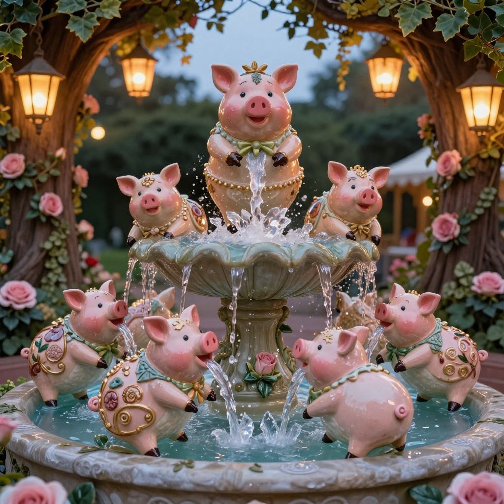 Miss Piggy fountain in a fairytale setting, intricate ceramic pig figures pouring crystal water, surrounded by roses and ivy, soft glowing lanterns hanging from nearby trees under twilight