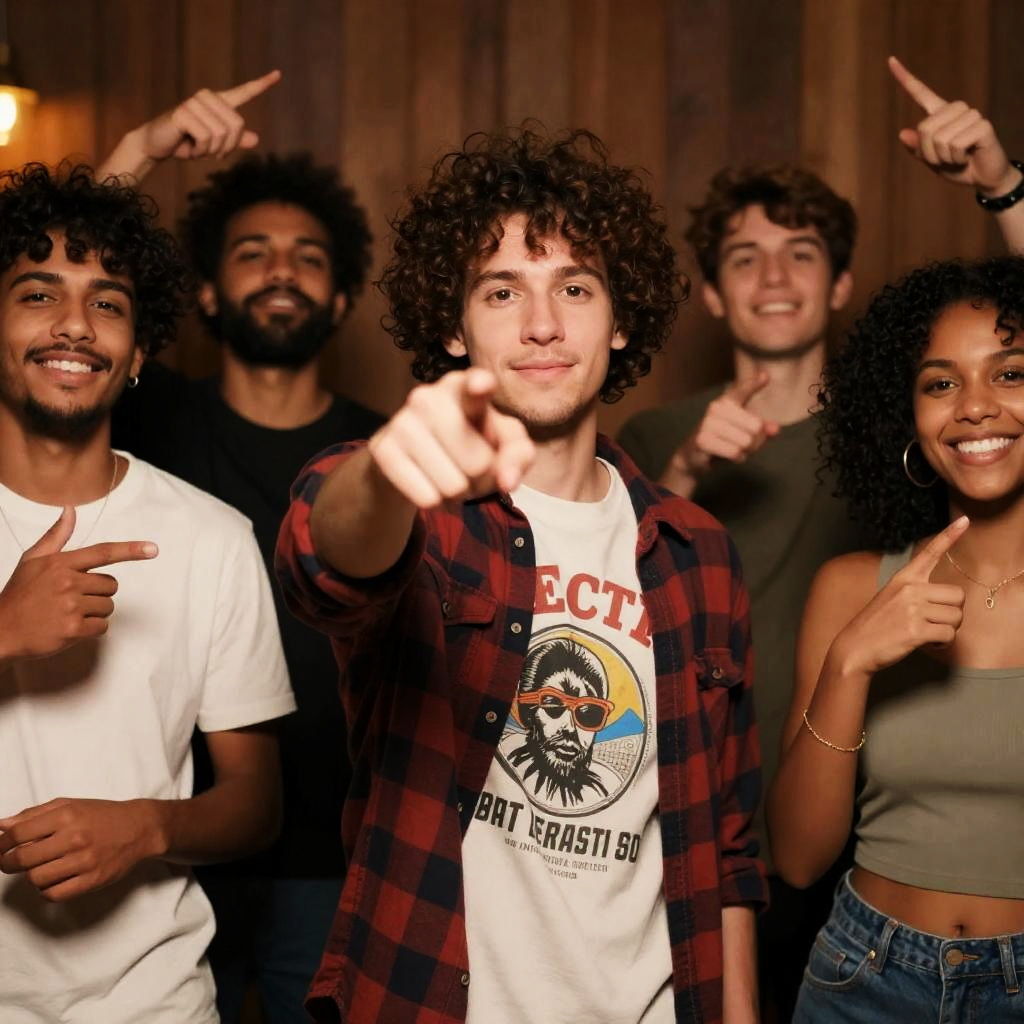 Photograph of a lively party scene. Central man with curly hair, plaid shirt, and graphic tee, pointing forward. Surrounding people, diverse ethnicities, pointing and smiling. Afros, beards, casual clothes. Warm, dim lighting. Background with wooden paneling.