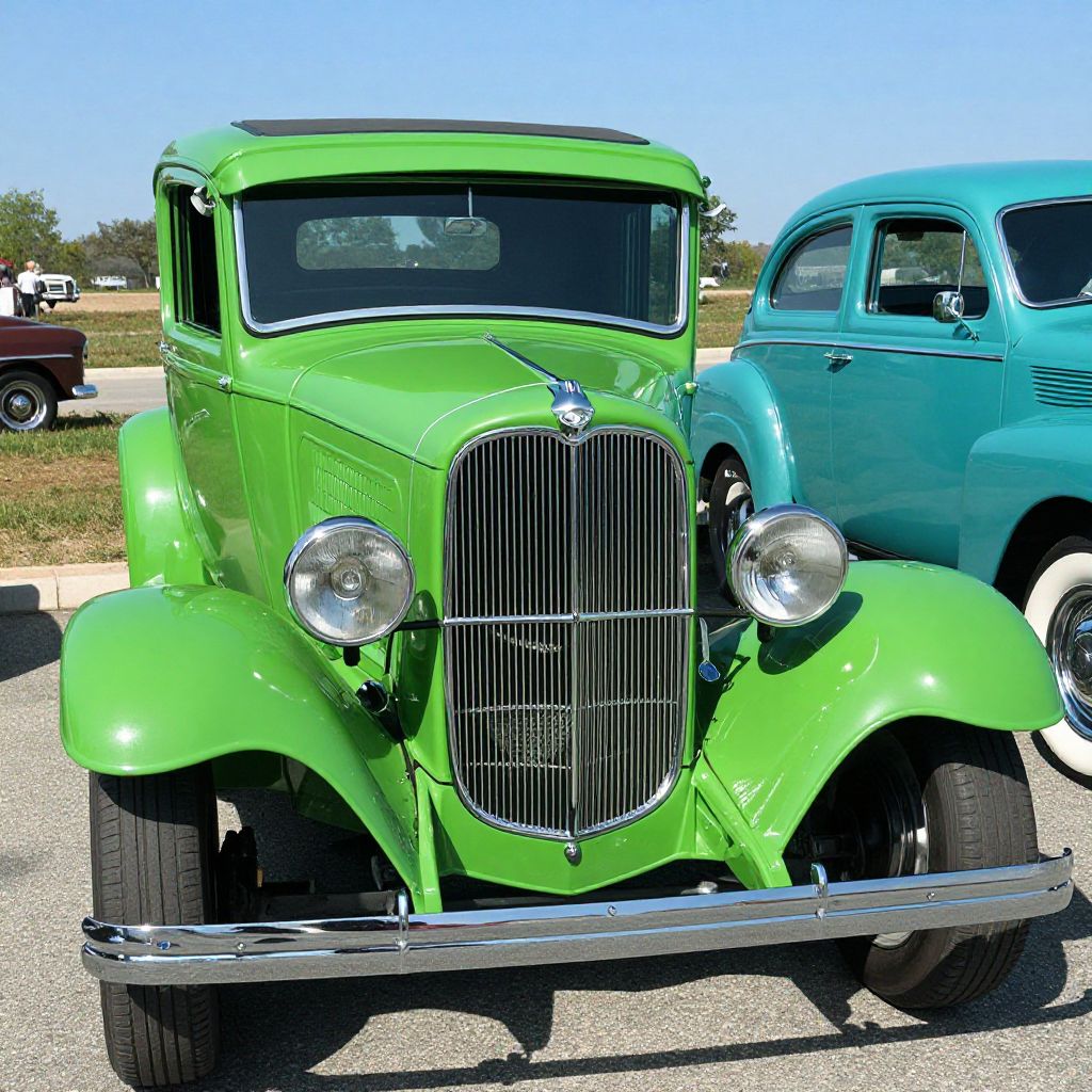 Photograph of a vibrant green vintage car with a shiny chrome grille, large round headlights, and black tires, parked beside a blue classic car on a