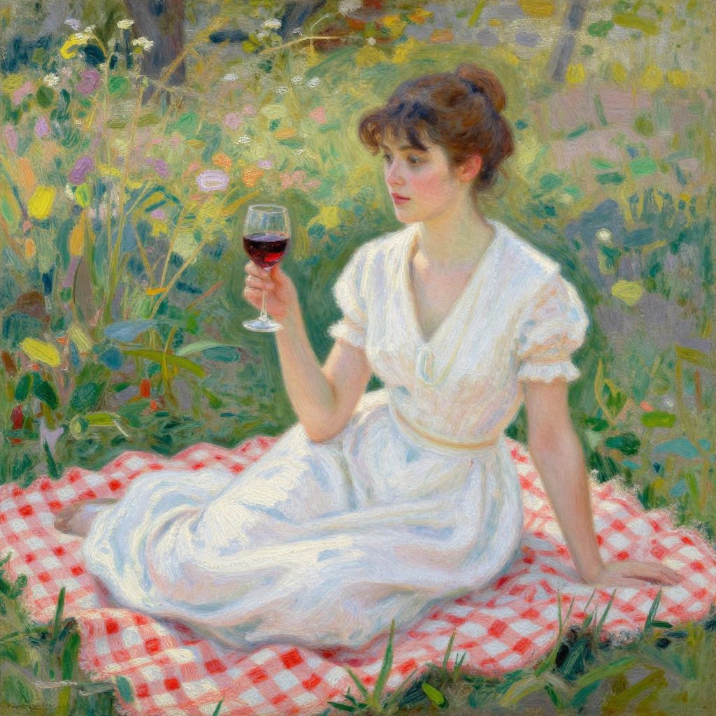 A serene oil painting depicts a woman in a white dress sitting on a red-and-white checkered blanket in a sunlit meadow, holding a glass of red wine, evoking the impressionistic style reminiscent of Claude Monet's \"Lunch on the Grass.\