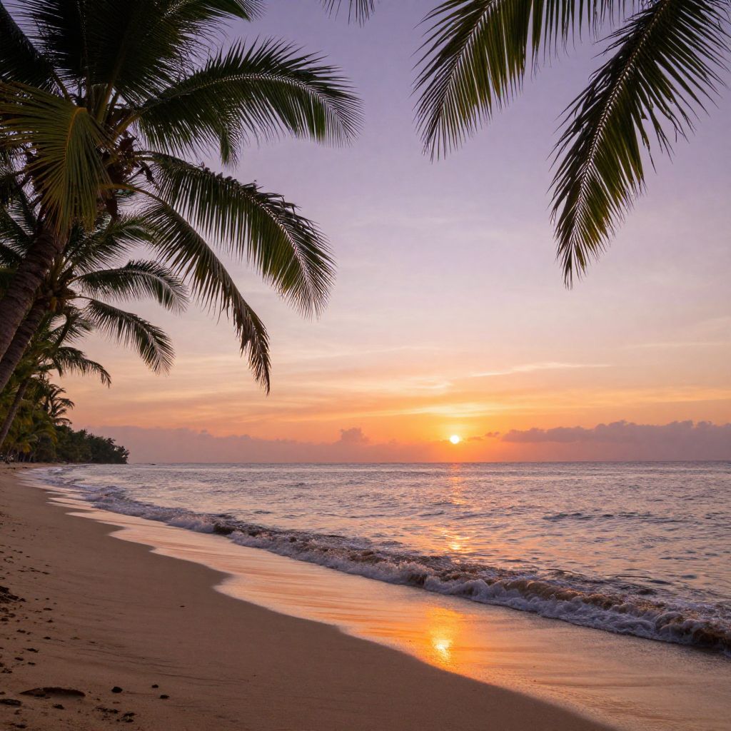 A serene tropical landscape featuring a winding stone pathway leading through lush greenery and tall trees toward a sandy beach with gentle ocean waves. Bright morning sunlight breaks over distant mountains, casting a warm golden glow across the sky and water. A single bird soars near the sun, enhancing the peaceful and inviting atmosphere of the scene.