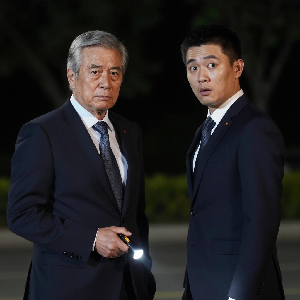 Two older men standing in a room. Left man in dark pinstripe suit, right man in brown suit with white shirt and black tie. Right man has glasses, both looking downward. Large lamp with yellow shade on right. White curtains in background.