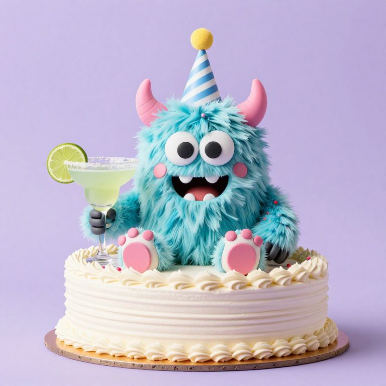 Photograph of a whimsical, blue, fuzzy, cartoon monster cake topper with pink horns, large white eyes, and a pink tongue. It wears a blue and white striped party hat with a yellow pom-pom. The monster holds a cocktail glass with a lime wedge in its right hand. The cake has white, piped frosting and sits on a round, brown cake board. The background is a soft, light purple. The overall style is playful and festive, with a focus on bright, contrasting colors and fun, childlike elements.