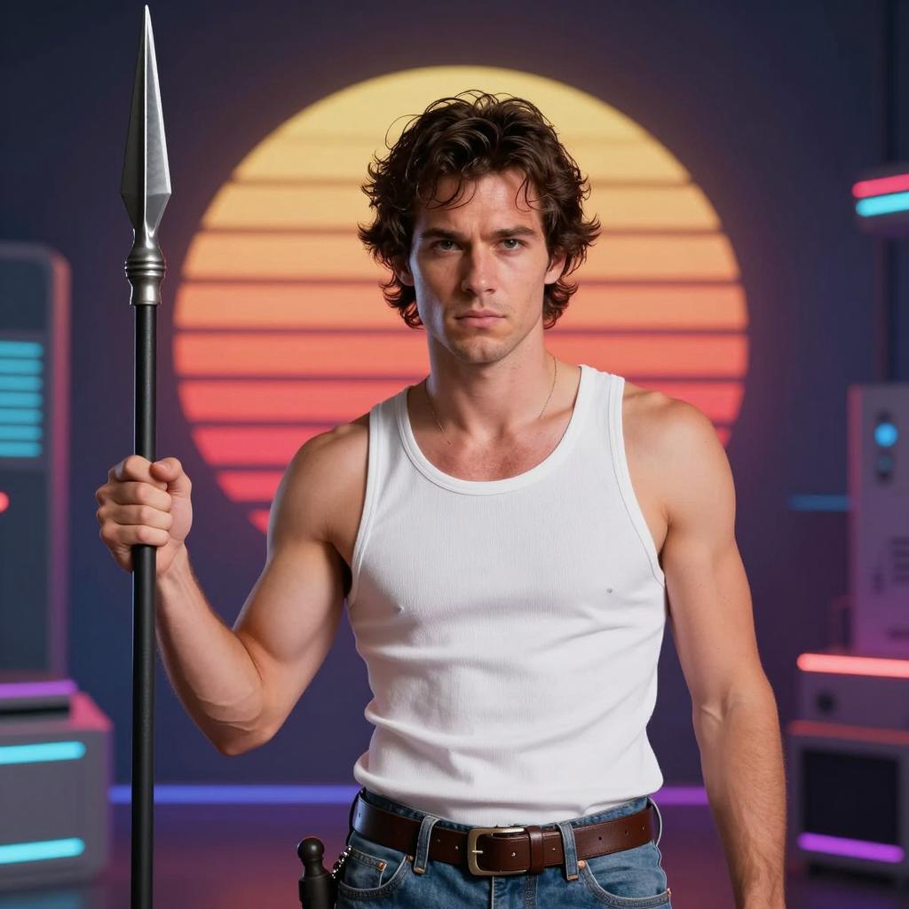 An artistic representation of a man confidently holding a spear, set against a vibrant, retro-futuristic backdrop reminiscent of 80s synthwave aesthetics.