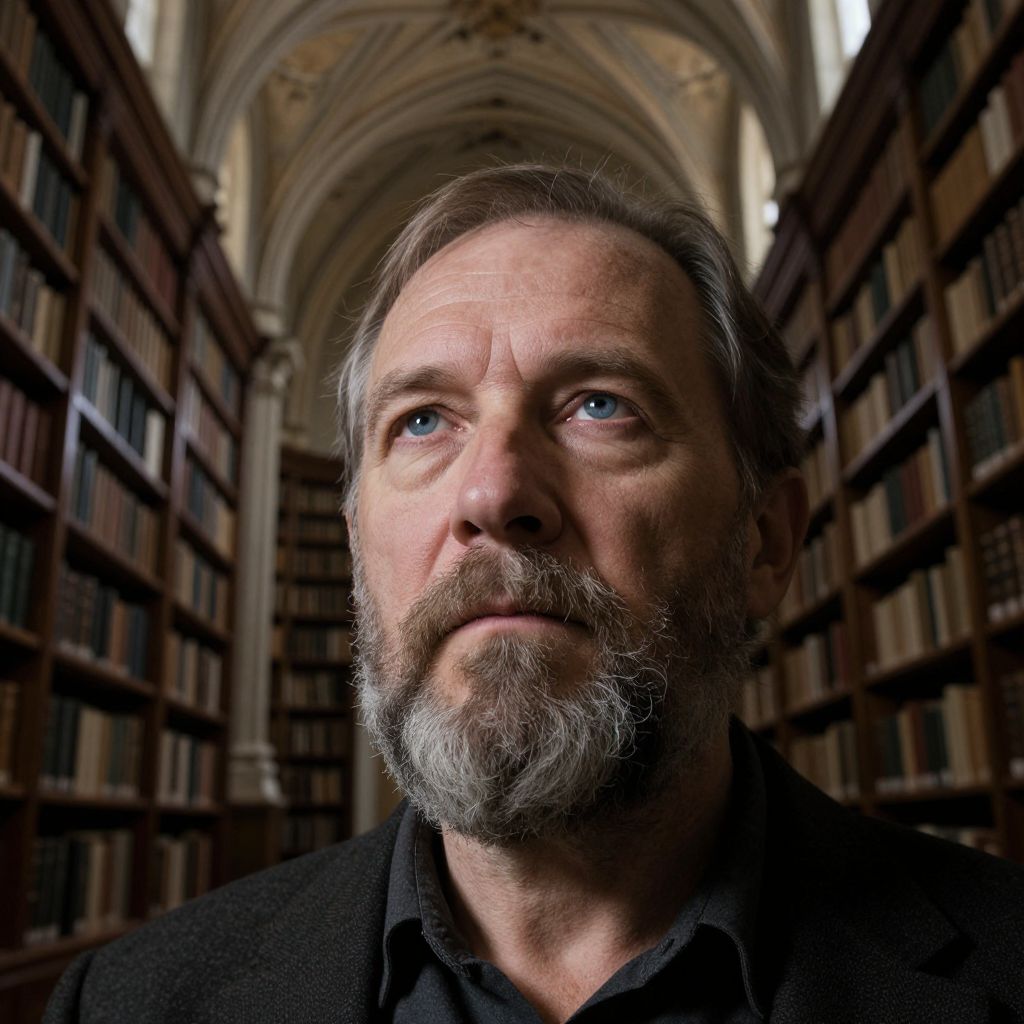 Craft a photorealistic portrait of a middle-aged Slavic man with tranquil blue eyes and a graying beard, exuding wisdom against an ancient library's backdrop. Capture this scene from a low angle to emphasize the towering bookshelves stretching towards a distant vaulted ceiling. Employ dramatic lighting that illuminates his seasoned face, casting deep shadows on time-etched lines while highlighting his intense gaze, reflecting knowledge and introspection. This image should evoke reverence for wisdom amidst isolation in human knowledge's vastness, balancing awe with poignant emotion.