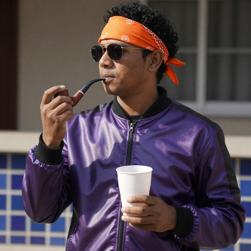 Photograph of a man with curly black hair, wearing an orange bandana, sunglasses, and a shiny, iridescent purple and black jacket. He holds a wooden pipe in his right hand and a white plastic cup in his left. Background includes a blurred building and blue-tiled surface. Sunlight highlights his jacket's reflective ure.