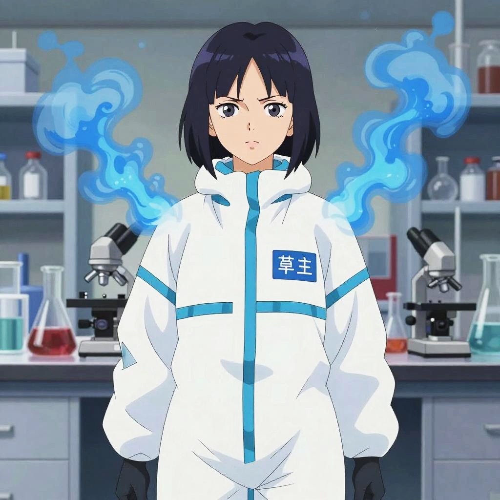 Walter White anime girl standing in a chemistry lab, wearing a hazmat suit with vibrant blue smoke swirling around, intense focused eyes, vibrant anime art style, detailed background