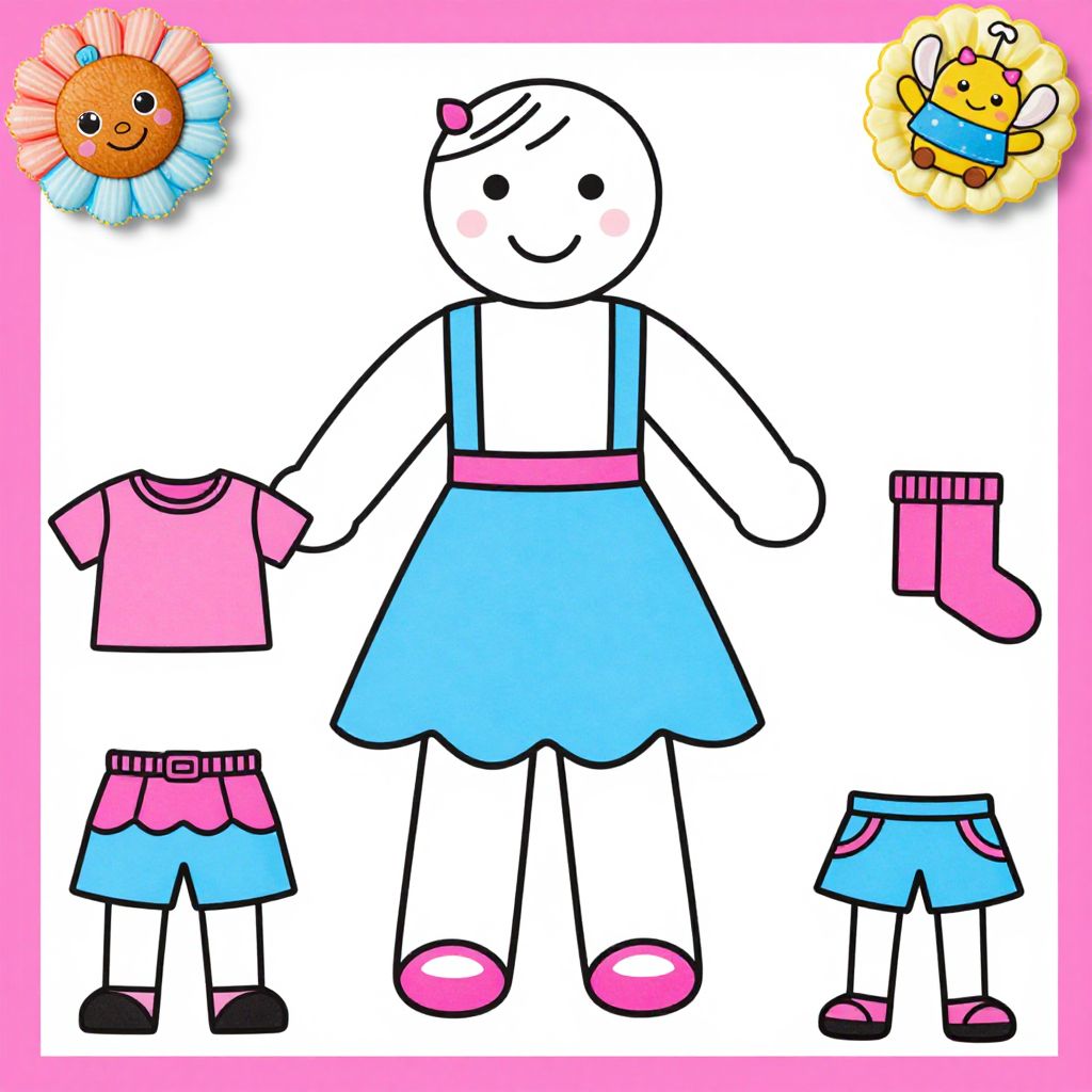 A colorful, digital, children's drawing features a white, smiling, cartoon doll with a pink bow and blue dress with pink suspenders and shoes. Surrounding the doll are four separate clothing items: a pink T-shirt, blue shorts with pink trim, pink socks, and blue shorts with pink trim. The background is white with a pink border. In the top left corner, there's a sun with a smiling face, and in the top right, a yellow bear holding a cup. The style is simplistic and playful, appealing to young children.