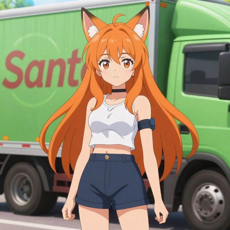 An anime-style character with long orange hair and fox ears stands confidently in front of a green truck with the words \"Santo\" and \"Santo\" on it.