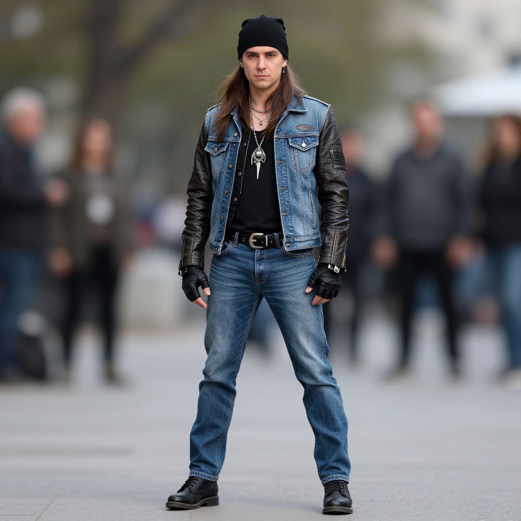Photograph of a young Caucasian man with long brown hair, wearing a black beanie, black leather jacket, blue denim vest, black t-shirt, blue jeans, black belt with silver buckle, black boots, and black fingerless gloves. He stands confidently in the center of an outdoor urban setting, with a blurred background of people and trees. He has a silver necklace with a cross pendant. The image has a shallow depth of field, focusing sharply on the man while the background remains blurred. The overall style is casual with a slightly edgy, rock-inspired look.