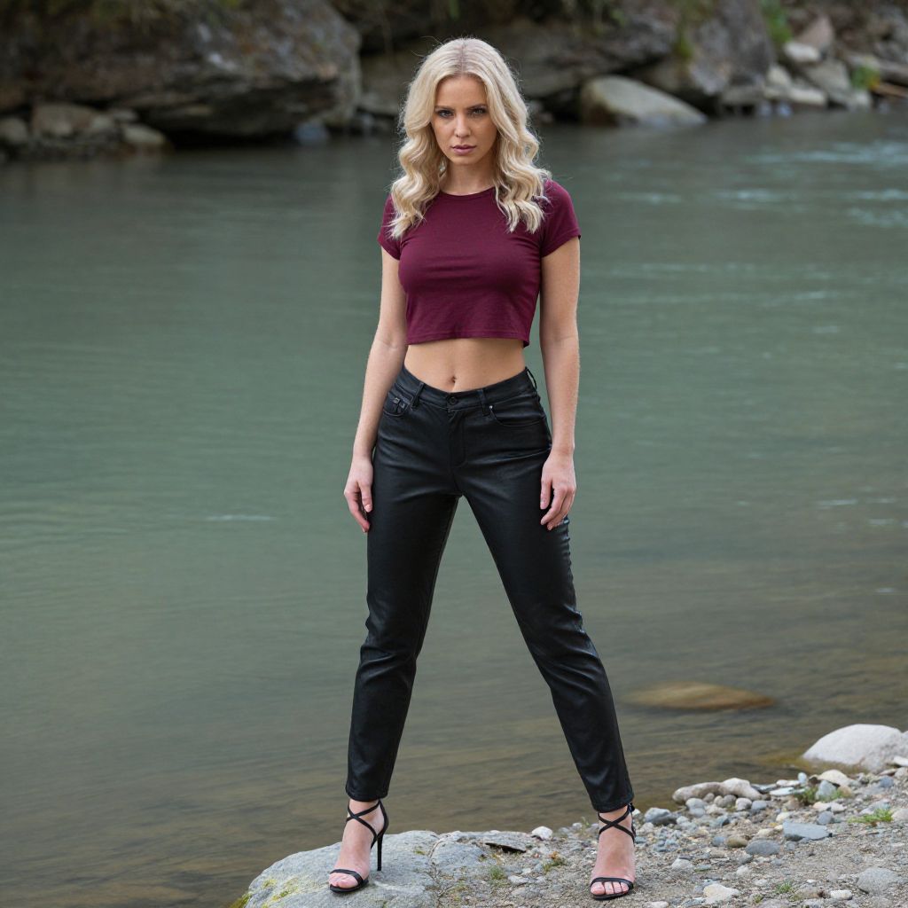 A photograph of a blonde woman standing by a calm, shallow river. She has wavy hair, a serious expression, and is wearing a burgundy crop top that reveals her midriff, black leather pants, and strappy black high heels. The background shows a rocky riverbank with clear, greenish water. The lighting is natural, highlighting her outfit and the serene water.