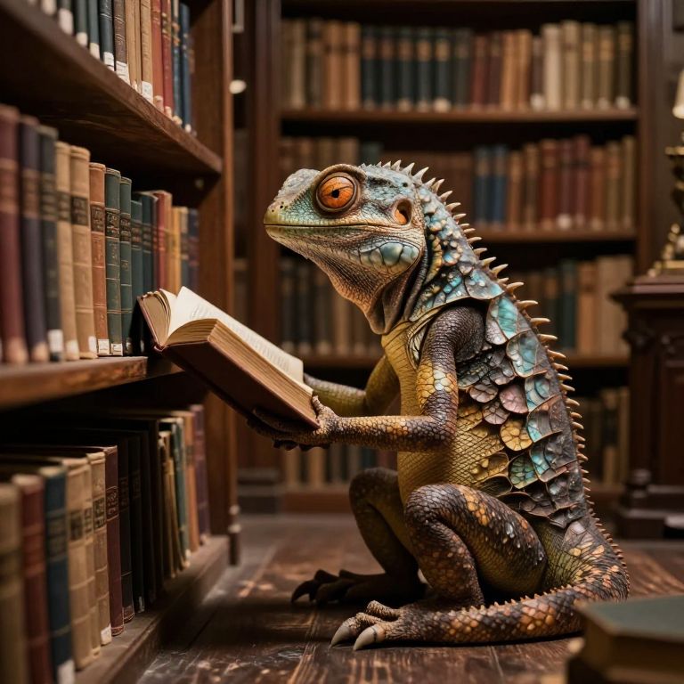 Curious reptilian creature perched on its haunches, intently studying an open book amidst rows of wooden shelves filled with countless volumes in a dimly lit, ancient library.