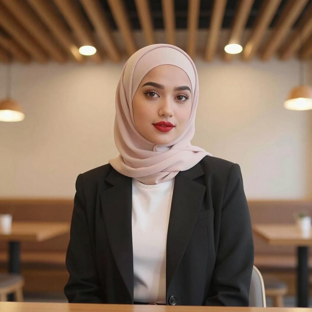Photograph of a young woman with light brown skin and dark eyes, wearing a tight, long-sleeved, gray dress and a matching pink hijab. She stands in a modern, dimly lit restaurant, hands clasped in front, with blurred tables and green plants in the background.