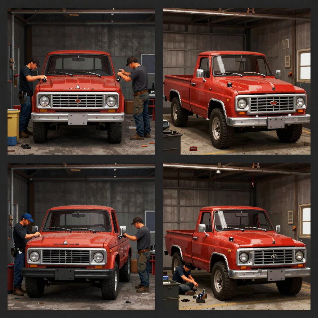 This image is a pixelated photograph of a dimly lit garage with four panels. It features two old, red trucks in different states of repair. In the top two panels, workers in casual clothes are tinkering with the trucks. In the bottom two panels, more workers are gathered around the trucks, some sitting and others standing. The garage has a gritty, industrial feel with scattered tools and parts.