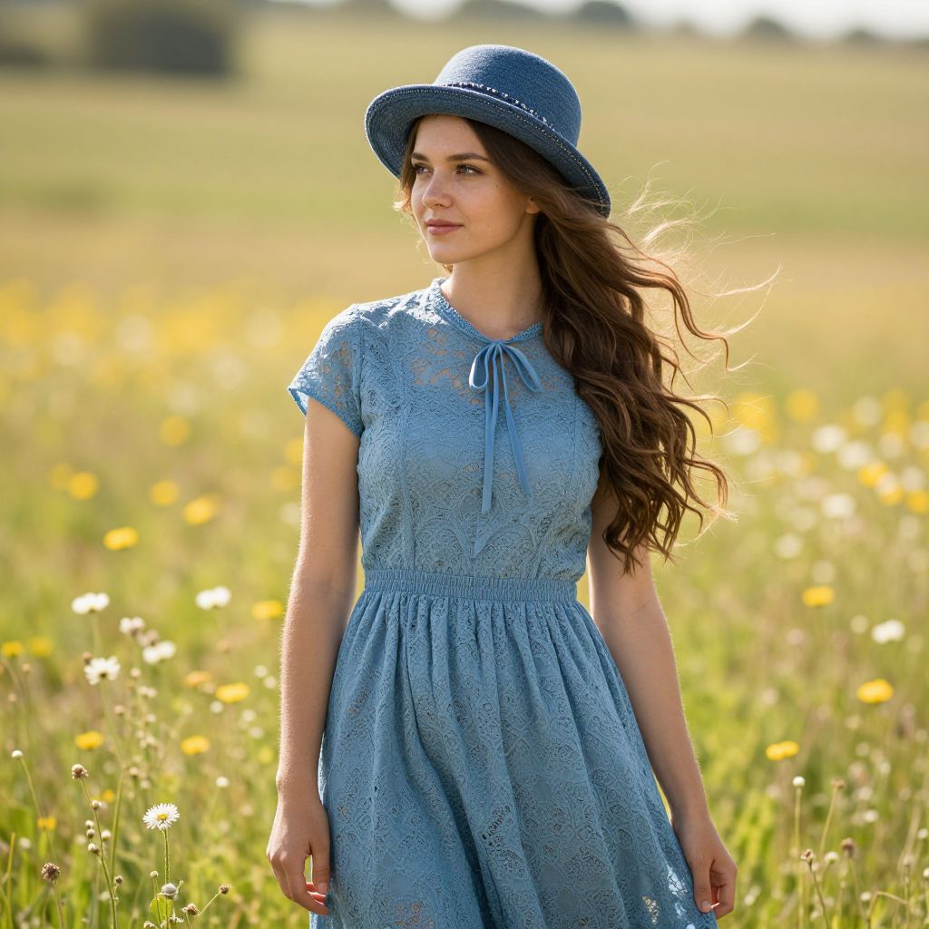 Young Woman in Blue Dress and Hat in Meadow