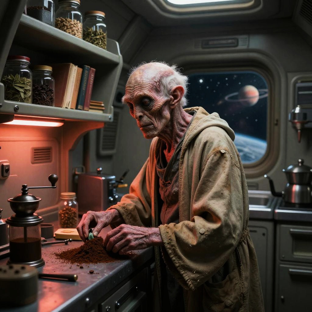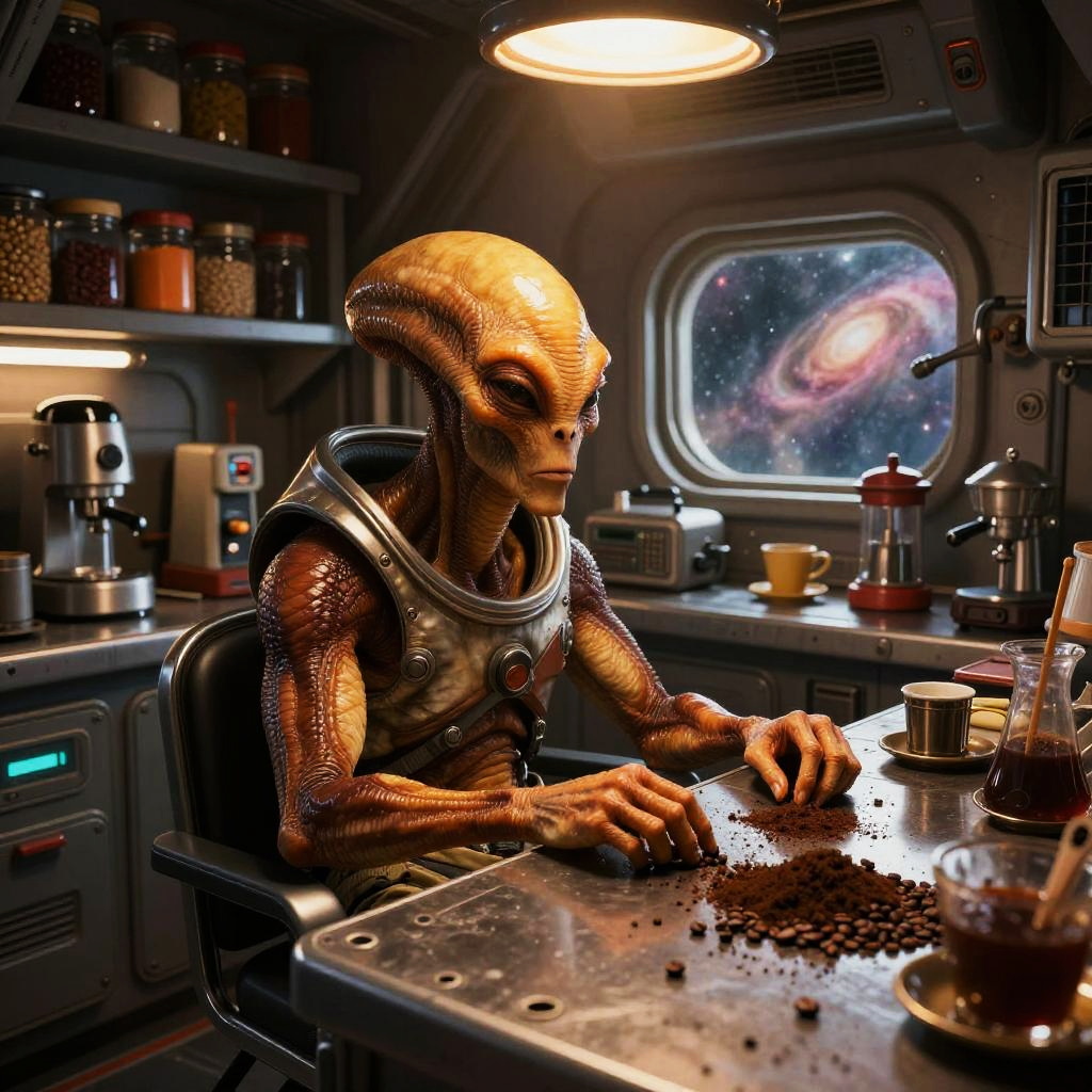 A young alien woman with pink hair and a teal dress sits in a cluttered futuristic spaceship kitchen. The scene features metallic appliances and pots surrounding her, with coffee beans scattered across the floor and counters. The space outside is visible through a large window, creating a cozy yet chaotic atmosphere with dim ambient lighting and colorful tones.