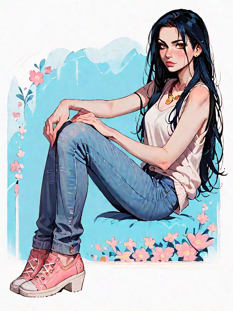 1girl, source_comics, realistic face, full body shot, Woman, casual, loose-fitting maroon cardigan, white tank top, layered gold necklaces, dark blue skinny jeans, straight long hair.
