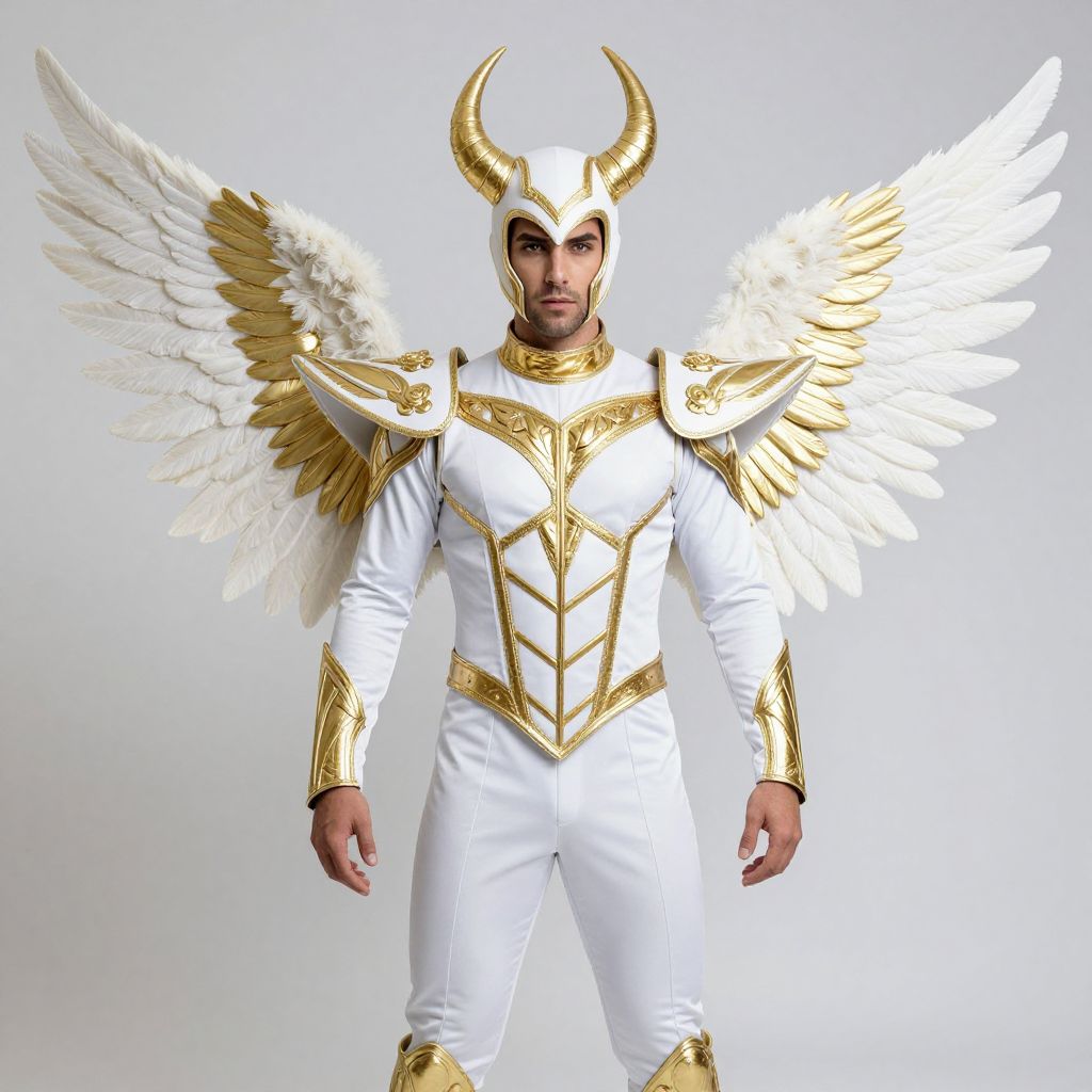 Photograph of a muscular man standing against a plain white background. He wears a white, form-fitting, long-sleeved suit adorned with intricate gold armor-like patterns on the chest, shoulders, and cuffs. His head is crowned with a golden helmet featuring two curved horns. Large, white, feathered wings extend from his back. His expression is serious, with dark eyebrows and a focused gaze. The suit and helmet have a shiny, metallic texture, contrasting with the soft feathers of the wings. The overall style is reminiscent of a superhero or angelic costume, with a strong, powerful presence.