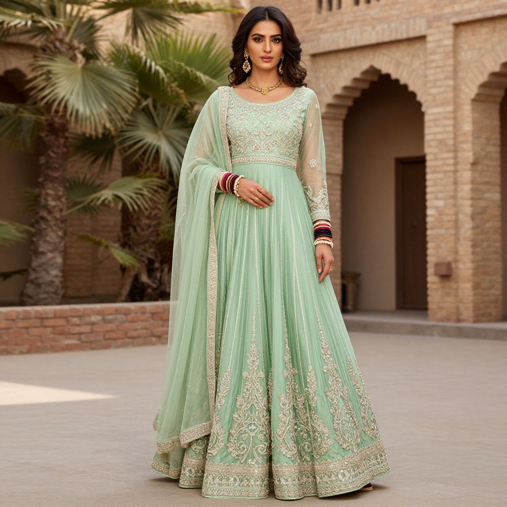 Elegant woman standing gracefully in a stunning floor-length anarkali gown, featuring soft green netting, intricate embroidery, and long lace sleeves, complemented by gold jewelry and colorful bangles, set against a backdrop of brick architecture and lush palm trees.