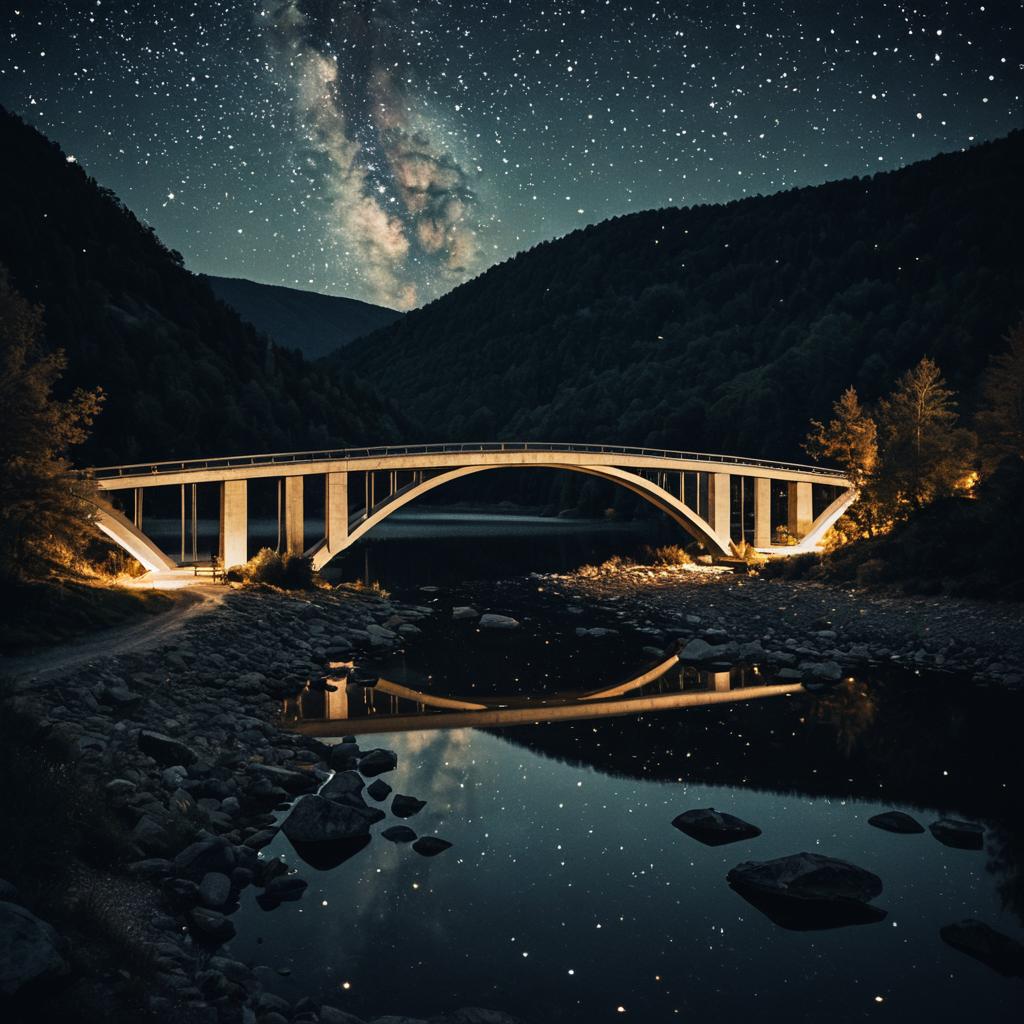 Valley A bridge by a lake at night, in the style of Stoicism, soft earth tones, captivating lighting, glazed surfaces, contemporary realism, creative commons attribution: sky full of blazing stars