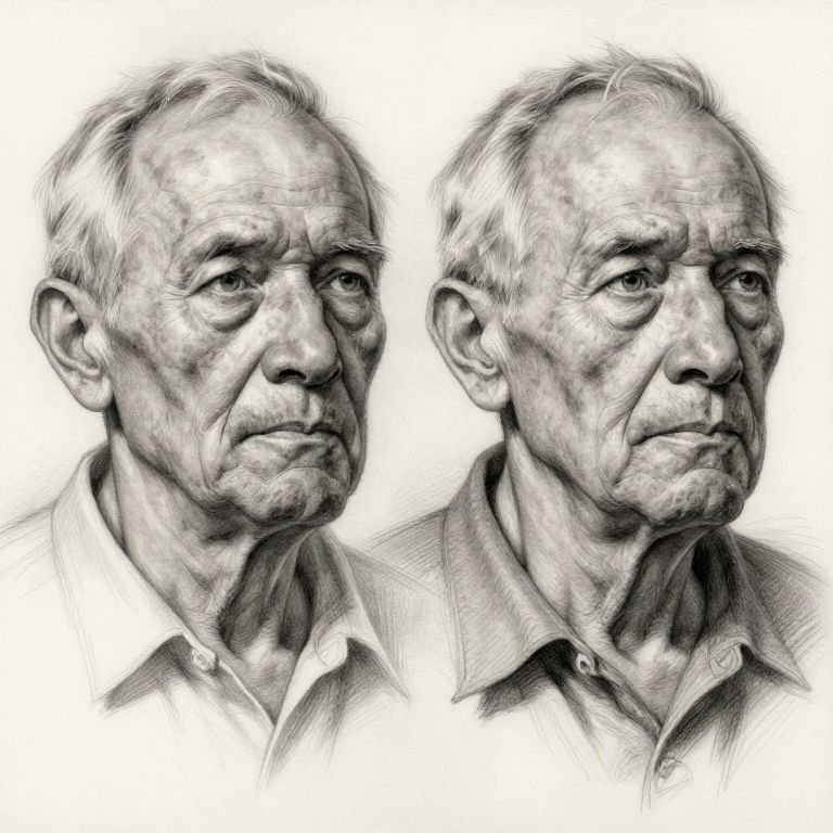 Drawing realistic faces with a focus on elderly subjects, highlighting wrinkles, age spots, and skin folds, detailed pencil sketch with soft shadows and highlights, introspective and wise expressions, photorealistic texture rendering