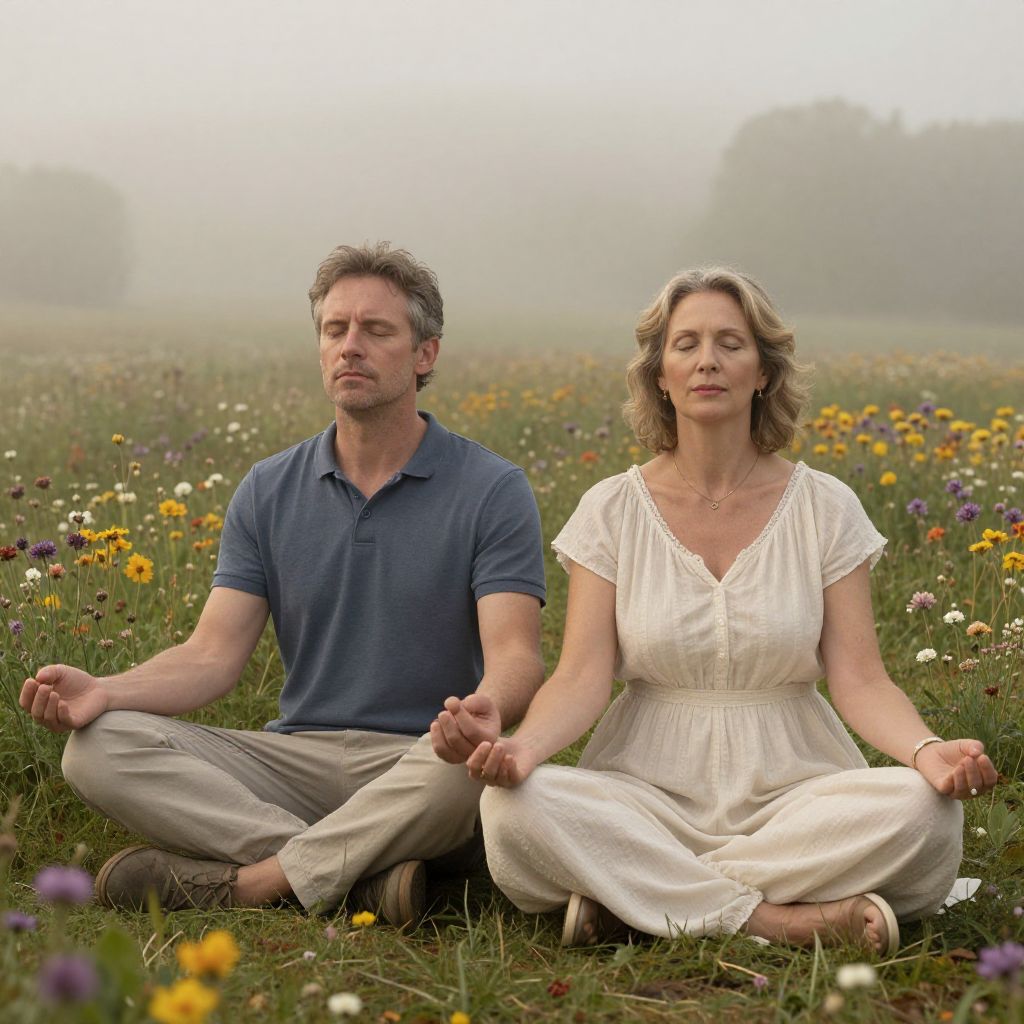 Mature Couple Meditating in Misty Flower Field