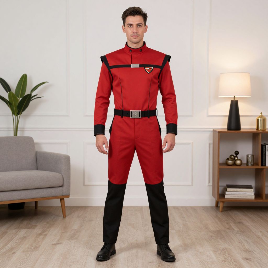 Northern Reflections Costume, man in a red and black costume standing in a room