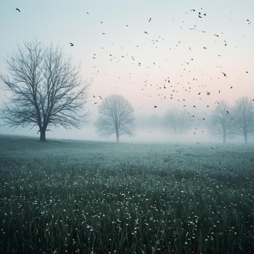 The Anxious Breeze depicted as a faint, restless breeze looking down at a fog-covered meadow at dawn. The breeze has a hesitant swirl, with tiny leaves gently drifting, symbolizing its unease. The illustration conveys a gentle, emotional tone, with cool pastel colors and delicate details to enhance the mood. The scene captures a sense of uncertainty and anticipation, with the drifting leaves creating subtle movement in the fog, adding to the serene yet poignant atmosphere.