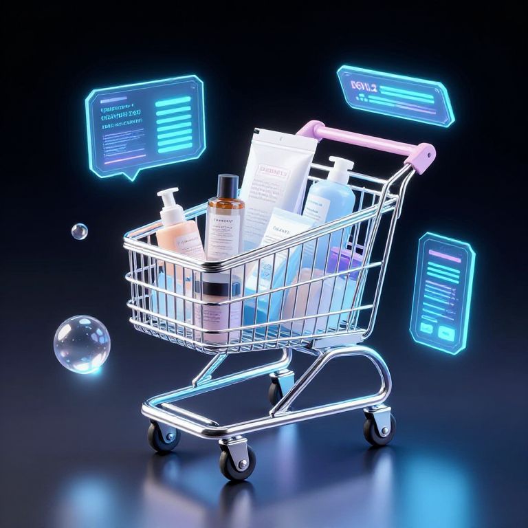 This digital CGI image features a metallic shopping cart with four wheels, filled with various household cleaning products, including bottles and spray bottles in white, orange, and blue. Neon blue holographic screens float around the cart, displaying text in a futuristic style. A glowing, transparent bubble hovers to the left. The background is a deep black, highlighting the bright, neon colors and reflective metal of the cart. The overall aesthetic is sleek and high-tech, combining elements of e-commerce and futuristic design.