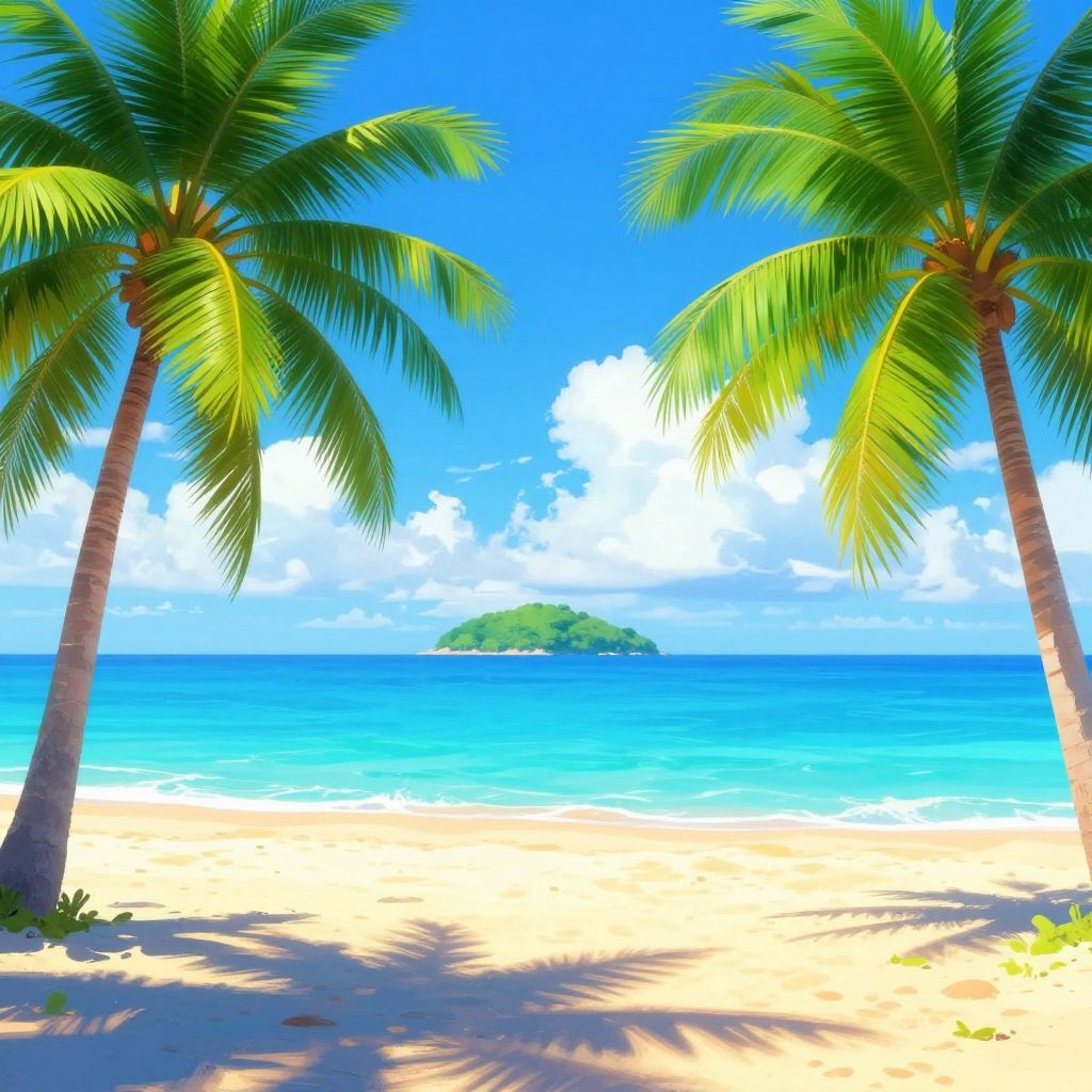 This vibrant digital painting shows a tropical beach scene framed by lush green palm trees on both sides. The sandy shore meets a calm, turquoise ocean, with a small, green island dotting the horizon under a bright blue sky filled with fluffy white clouds. The colors are hyper-saturated, giving the image an almost surreal, cartoonish feel.