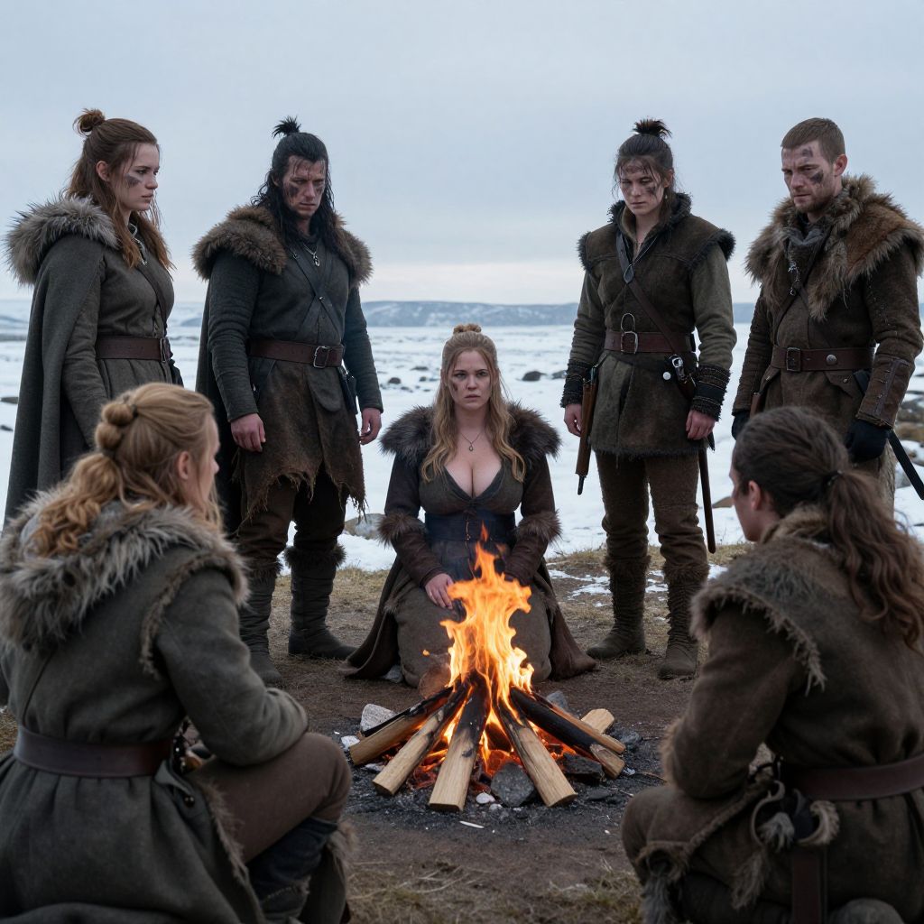 A cinematic wide shot of a group of five people dressed in wildling costumes gathered around a fire in a remote, snowy clearing, the faces captured with natural lighting - one woman has a stern expression, another looks guarded, all wearing authentic-looking gear with tattered cloaks and face paint, the setting feels isolated and raw, emphasizing survival and freedom.. The woman has big tits and cute face