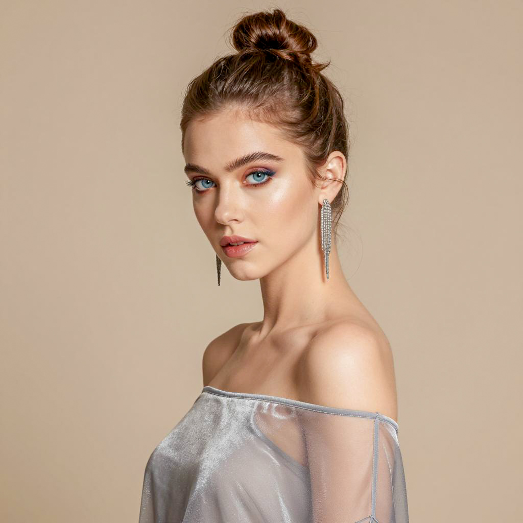 Photograph of a woman with fair skin and blue-green eyes. She has a high bun with loose strands, wearing a sheer, off-the-shoulder, silver-gray top. She has long, dangling silver earrings and dramatic, colorful eye makeup. Her lips are slightly parted. She is facing the camera, head turned to the side, with a neutral expression. Background is solid beige. She has a slender neck and defined collarbones.